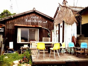 直島カフェコンニチハは、2010年7月海の日にopenしました。 目の前に海が広がる、民家を改装したカフェです。 お庭のウッドデッキ上の小屋が目印です。